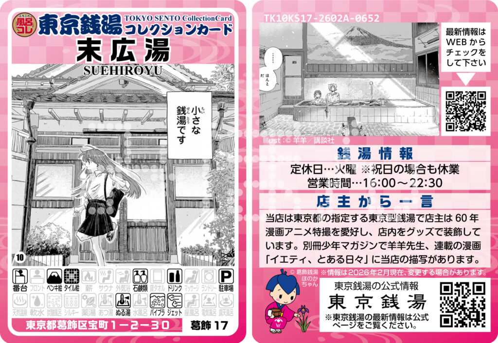 東京都葛飾区「末広湯(葛飾17)」さんと、別冊少年マガジンで連載中「イエティ、とある日々」(講談社)とのコラボ銭湯コレクションカードを2026年4月6日(月)より配布中です。「合言葉」を言うと1名様1枚限定で入手できます。作品中に登場したシーンをあしらったデザインになっています。