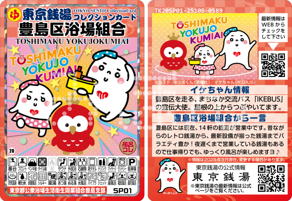 豊島区内を走る「IKEBUS(イケバス)」のキャラクター「イケちゃん」と、東京都浴場組合公式キャラクター「ゆっポくん」「ゆっピちゃん」をあしらったオリジナルデザインで、表面のフチはホログラム加工されています。