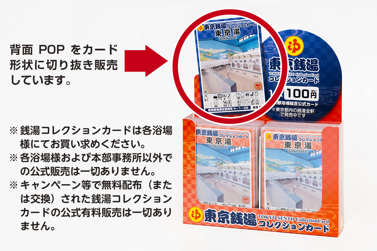 一部フリーマーケットサイトにおきまして「銭湯コレクションカード」のPOP(販売促進を目的とした掲示物)を加工し「レアカード」と称して販売されている事例が報告されております。